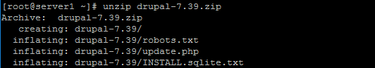 Setelah kami telah menginstal membutuhkan dependensi, kita dapat melanjutkan dengan instalasi Drupal. Jalankan perintah berikut untukunzippaket Drupal yang kita download.unzip drupal-7.39.zip