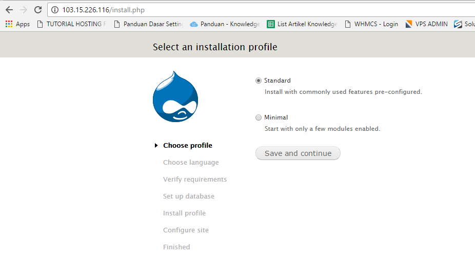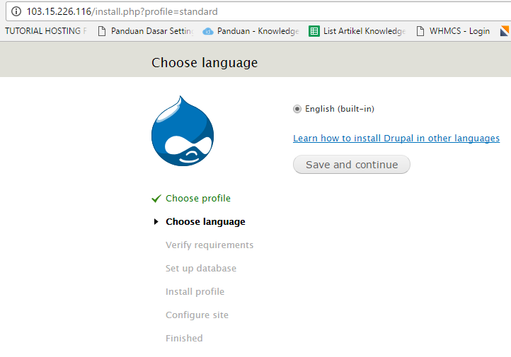 Server Anda sekarang dikonfigurasi dengan benar untuk menjalankan instalasi berbasis web dengan cara berikut: http://server_domain_or_IPAnda akan melihat halaman awal prosedur instalasi Drupal. Pilih instalasi standar.