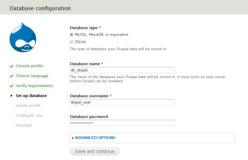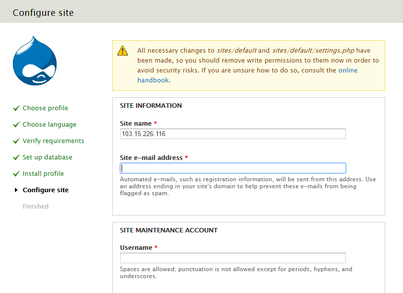 Setelah memasukkan info Database, semua yang perlu Anda lakukan sekarang adalah menjawab pertanyaan Drupal untuk situs Anda.