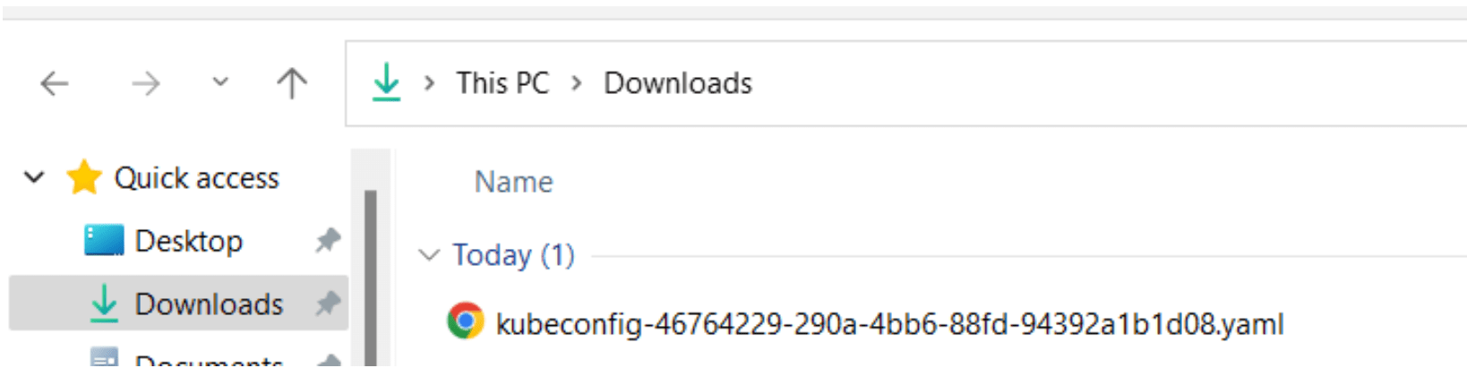 Setelah mengunduh file konfigurasi, cek pada folder tempat menyimpan file hasil unduh pada komputer. Terdapat file dengan nama kubeconfig-<uuid>.yaml. User dapat mengubah nama file tersebut untuk memudahkan melakukan implementasi.