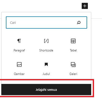 Tambahkan postingan baru di website Anda melalui menu Post > Add New. Setelah itu, pada bagian yang ingin Anda selipkan tabel, tambahkan blog baru hingga muncul pilihan menu seperti berikut. Klik ‘Jelajahi Semua’