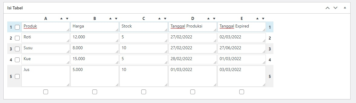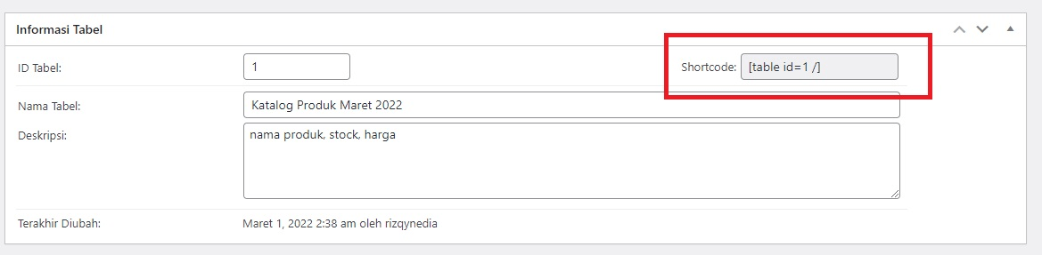 Untuk menambahkan tabel yang sudah Anda buat ke postingan WordPress, copy Shortcode yang terdapat pada menu Informasi Tabel paling atas.