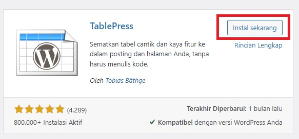 Pertama-tama, instal dan aktifkan plugin TablePress terlebih dahulu. Anda bisa melakukannya dengan mengakses menu Plugin > Add New. Setelah itu, cari TablePress di search box dan klik Instal sekarang lalu aktifkan.