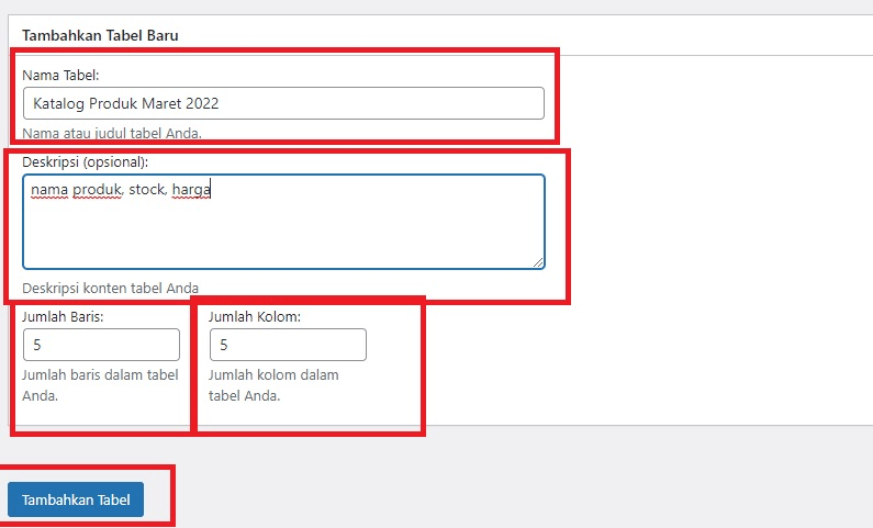 Selanjutnya, Anda bisa langsung memasukkan nama tabel, deskripsi tabel, serta jumlah baris dan kolom. Setelah semuanya sudah Anda atur, klik Tambahkan Tabel.