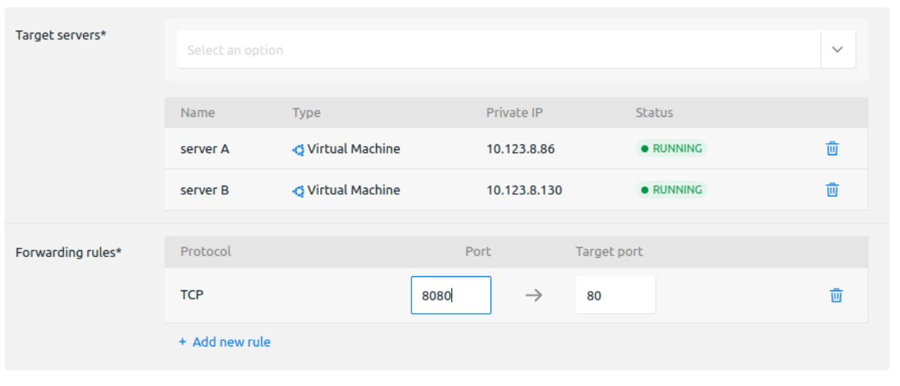 Ketika Load Balancer sudah disiapkan, diperlukan setidaknya satu aturan (forwarding rule) dan satu target. Namun, target yang sudah ditetapkan ini dapat ditambahkan atau dihapus oleh pengguna sesuai kebutuhan. Forwarding rule juga dapat diubah kemudian. Private network di mana Load Balancer beroperasi biasanya ditetapkan secara otomatis setelah LB dibuat.