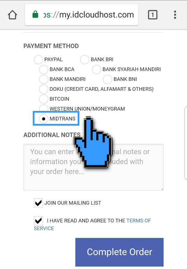 Gopay, jangan lupa Ceklis pada “Ã Have Read and Agree to the Term of Service“, kemudian klikComplete Order