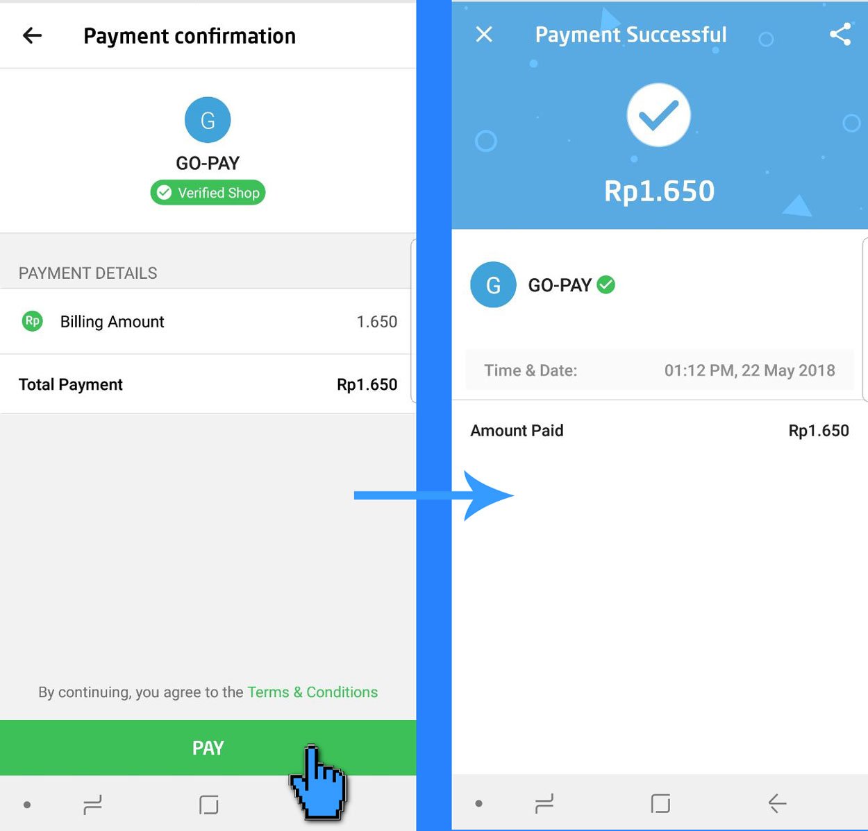 Pay. Aplikasi GOJEK akan secara otomatis mengirimkan pembayaran Anda hingga muncul pemberitahuan Pembayaran Berhasil