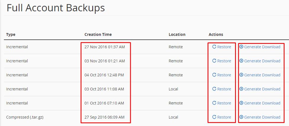Pada halaman Full Account Backups kita akan mendapati beberapa pilihan file backup pada tanggal-tanggal tertentu, Klik pada pilihan Restore untuk mengembalikan kondisi website pada tanggal yang dipilih, proses restore akan berlangsung cukup lama setelah kita melakukan klik.