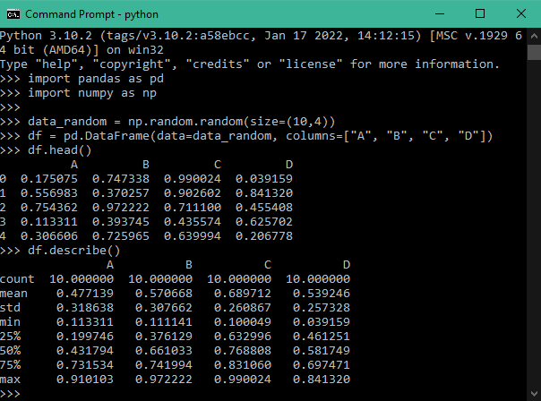 df = pd.DataFrame(data=data_random, columns=["A", "B", "C", "D"])