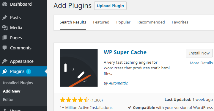 Plugin > Add Plugin > Search “WP Super Cache†> Install Now > Active.