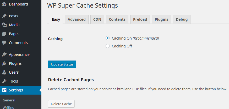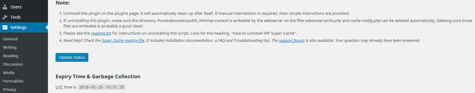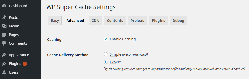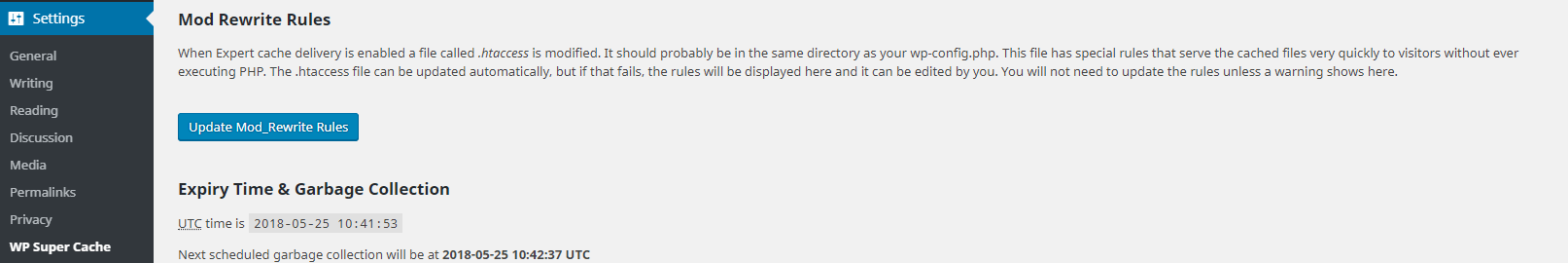 Untuk opsi Simple, opsi ini akan melayani file cachedengan menggunakan PHP. Kekurangannya membutuhkan banyak sumber daya. Sedangkan untuk opsi Expert, opsi ini menggunakan mod_rewriteApachemoduleuntuk melayani file cache. Kehebatannya prosesnya sangat cepat.PilihExpert > Update Status > Update Mod_Rewrite Rules. Â